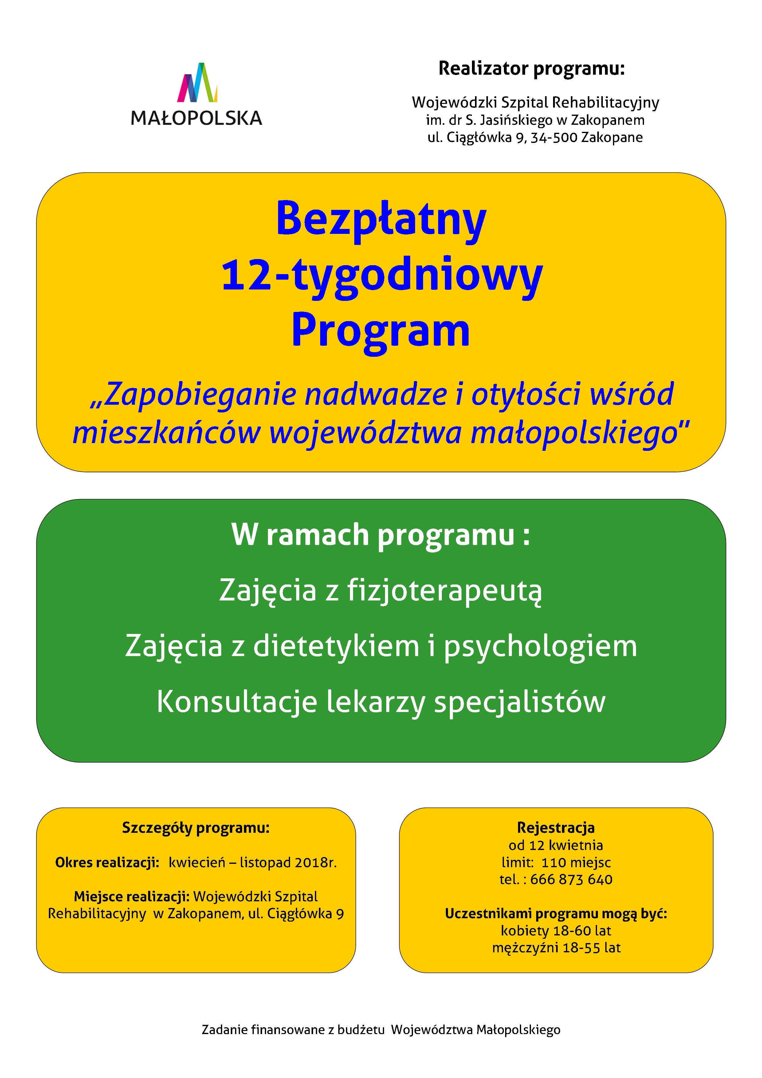 Miło nam poinformować, iż w Wojewódzkim Szpitalu Rehabilitacyjnym im. dr S. Jasińskiego w Zakopanem rusza program pn. „Zapobieganie nadwadze i otyłości wśród mieszkańców województwa małopolskiego” w 2018 r. finansowany z Budżetu Województwa Małopolskiego.