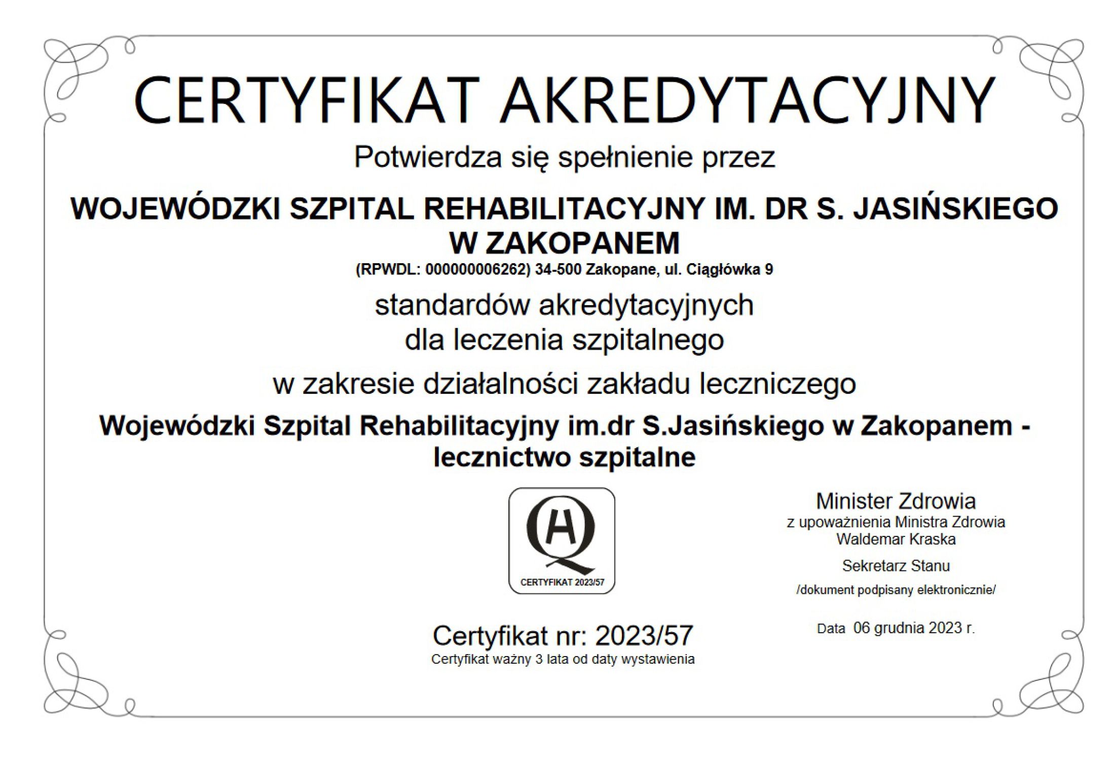 No i doczekaliśmy się. Po przeprowadzonej w dniach 4 – 6 października br. wizycie akredytacyjnej przedstawicieli Centrum Monitorowania Jakości w Ochronie Zdrowia wiedzieliśmy, że przeszliśmy tę wizytę pozytywnie, co skutkować będzie przedłużeniem Akredytacji Ministra Zdrowia na kolejne 3 lata. Ale między wiedzieć, a mieć pewność, ciągle jest niewielki cień niepewności. Teraz niepewność zniknęła i cieszymy się otrzymanym certyfikatem. Już od 2010 r. uważaliśmy, że ten Certyfikat jest najwyższym wyróżnieniem naszego Szpitala. Poddajemy się ocenie co kolejne 3 lata i zawsze towarzyszy nam radość z jego przedłużenia. Aby ta radość trwała nieprzerwanie, już po zakończeniu jednej wizyty akredytacyjnej przygotowujemy się do następnej. Bo przecież 3 lata szybko miną, a my nie chce odkładać przygotowań na ostatnią chwilę. Zresztą 14 lat z Certyfikatem podpowiada nam, co jeszcze możemy poprawić.