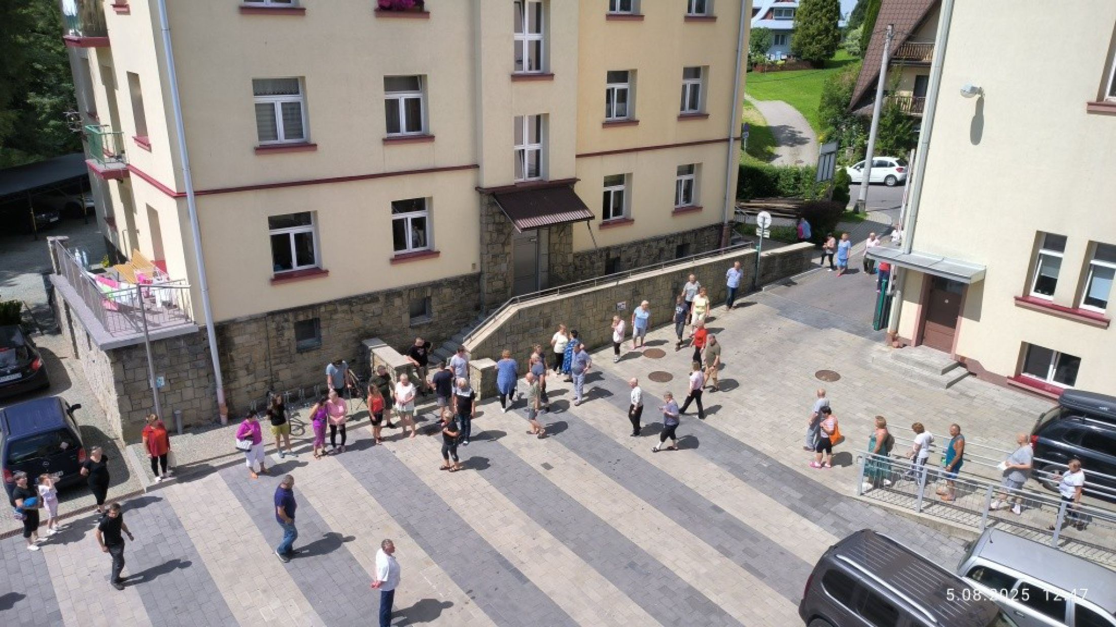 Jak co roku przeprowadzono w Szpitalu ćwiczenia w zakresie praktycznego sprawdzenia organizacji oraz warunków ewakuacji. W dniu 05.08.2025 r. po zaistnieniu symulowanego pożaru przeprowadzono ewakuację pacjentów i pracowników przebywających w kilku pomieszczeniach: stołówce, gabinecie ciepłolecznictwa, krioterapii miejscowej, fizjoterapii ambulatoryjnej, rehabilitacji pulmonologicznej i terapii zajęciowej. W sumie ewakuacja objęła 63 pacjentów i 19 pracowników (w tym personel firmy cateringowej). Stosowaną corocznie zasadą jest, że ćwiczenia nie są zapowiedziane. Tak więc dla pacjentów oraz pracowników stanowią zaskoczenie. Asekurowani przez pracowników pacjenci po opuszczeniu budynku zostali doprowadzeni do oznaczonego miejsca zbiórki. W miejscu zbiórki nie zabrakło przedstawicieli pionu medycznego (pielęgniarki), które dbały o dobrostan nieco zestresowanych pacjentów. Cieszy zdyscyplinowanie pracowników i bardzo dobra znajomość zasad postępowania w przypadku zagrożeń. Pozytywnym elementem było także zdyscyplinowanie ewakuowanych pacjentów. Całość działań organizacyjnych i sposób przeprowadzenia ewakuacji uzyskały wysoką ocenę pracowników odpowiedzialnych za ćwiczenia.