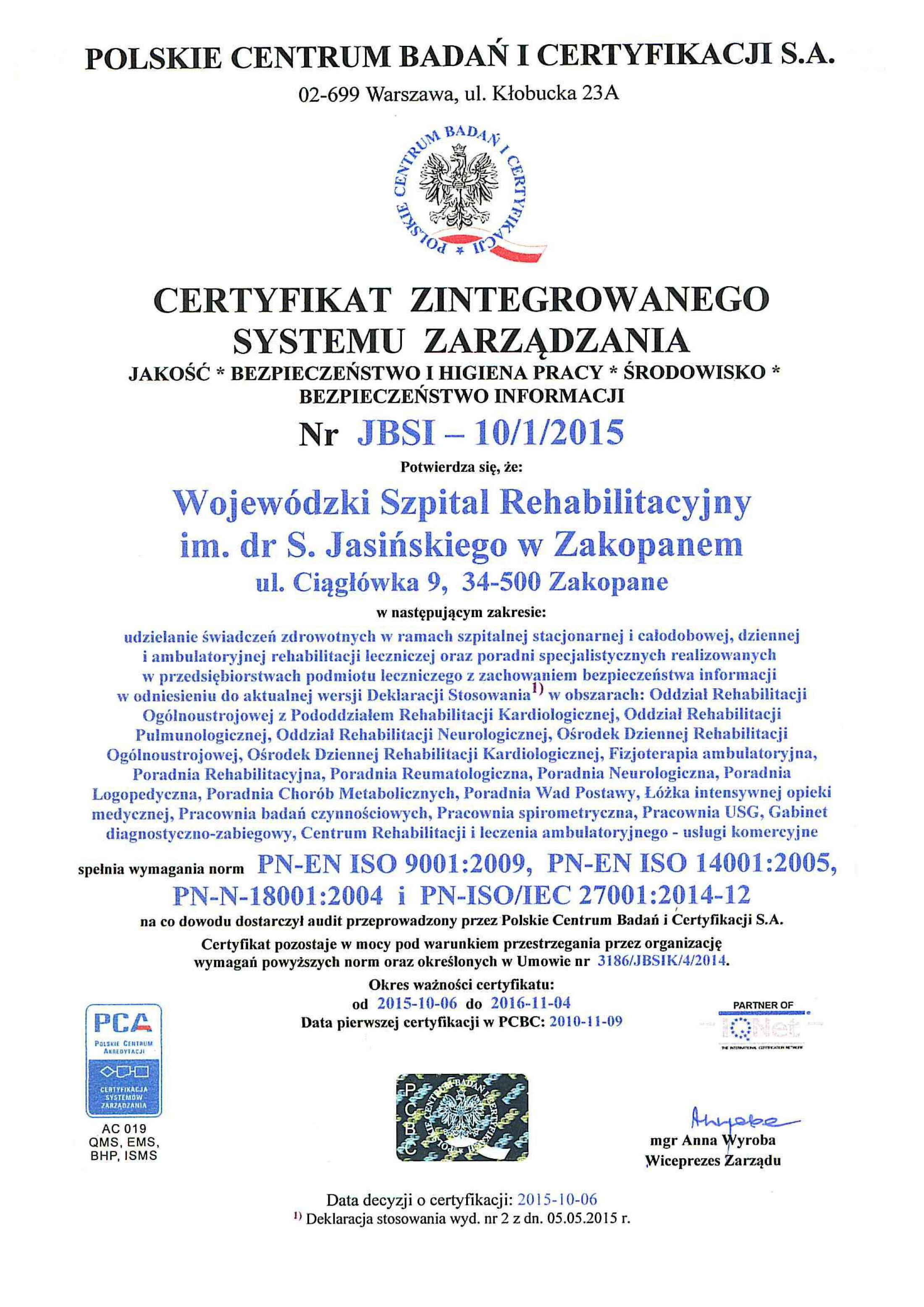 W naszym szpitalu pracują doświadczeni lekarze specjaliści rehabilitacji medycznej, neurologii, balneoklimatologii, fizjoterapii, kardiologii, chorób wewnętrznych, medycyny ratunkowej, pediatrii, ortopedii, chirurgii. Wkład pracy jaki wnosi zespół medyczny wraz z zespołem pielęgniarskim oraz rehabilitacyjnym przynosi wiele satysfakcji w leczeniu naszych pacjentów. Trud ten został doceniony przyznaniem Certyfikatu Systemu Zarządzania Jakością wg wymagań międzynarodowego standardu PN-EN ISO 9001:2009, PN-EN ISO 14001:2005, PN-N-18001:2004, PN-ISO/IEC 27014:2012. Zakres systemu objął udzielanie świadczeń zdrowotnych w ramach całodobowej szpitalnej, dziennej i ambulatoryjnej rehabilitacji leczniczej w naszym Szpitalu. Szpital otrzymał od Ministra Zdrowia Certyfikat Akredytacyjny, który potwierdza spełnienie przez Szpital standardów akredytacyjnych dla lecznictwa szpitalnego. Od wielu lat posiadamy Certyfikat Polskiej Sieci Promujących Zdrowie (Polish Network of Health PromotingHospitals and Health Services) oraz Certyfikat Systemu Przeciwdziałania Zagrożeniom Korupcyjnym.
