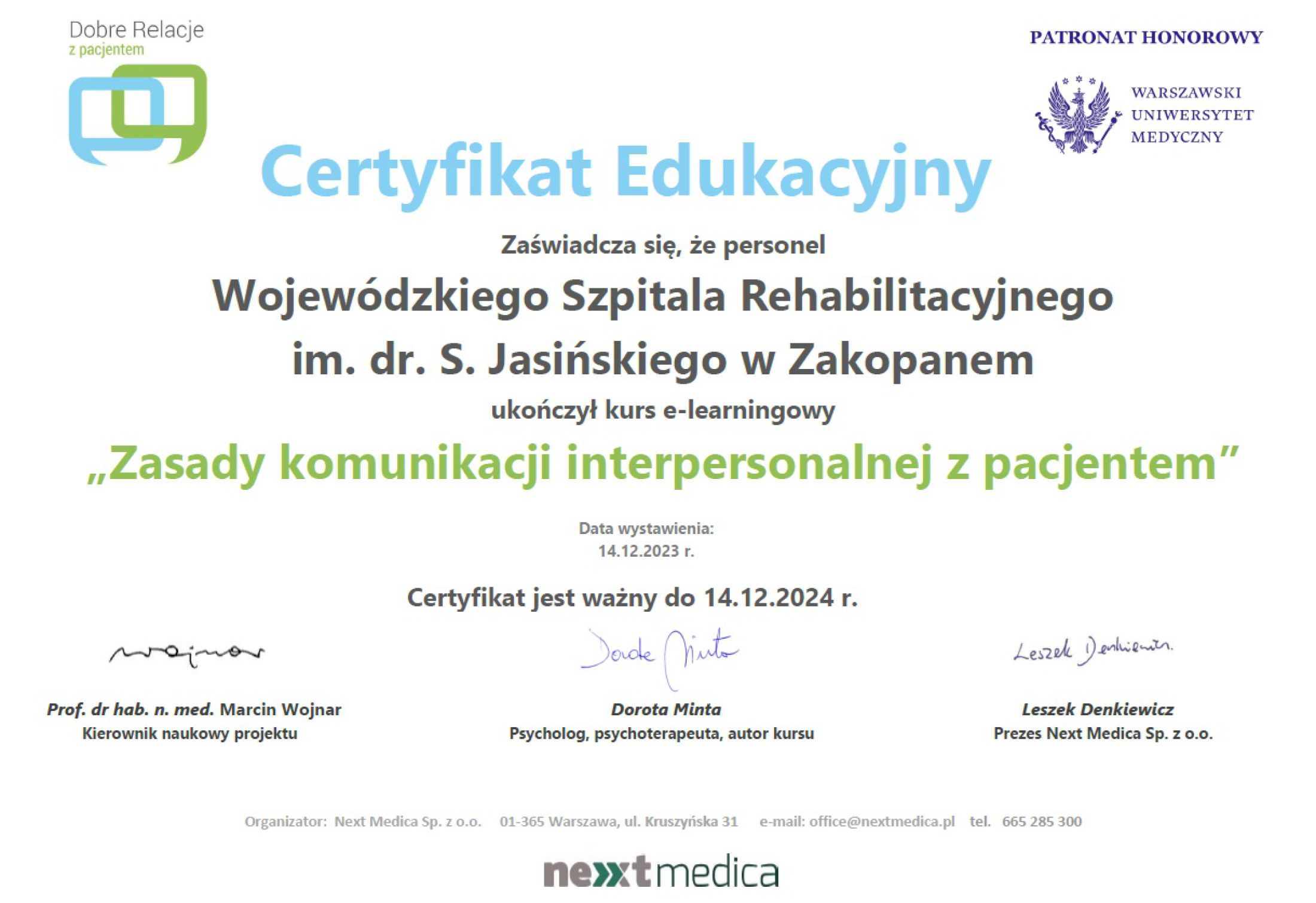 Dlatego pracownicy medyczni naszego Szpitala w prowadzonym w trybie e-learningowym kursie „Zasady komunikacji interpersonalnej z pacjentem”. Blisko 100 osób uporało się z kursem, zdając kolejne egzaminy, w niewiele ponad miesiąc. I wszyscy stwierdzali, że kurs był niezmiernie pożyteczny, unaocznił uczestnikom popełniane przez nich nieświadomie błędy i potknięcia. Kurs to także pomoc dla pracowników w rozumieniu różnorodnych zjawisk w relacjach z pacjentem.