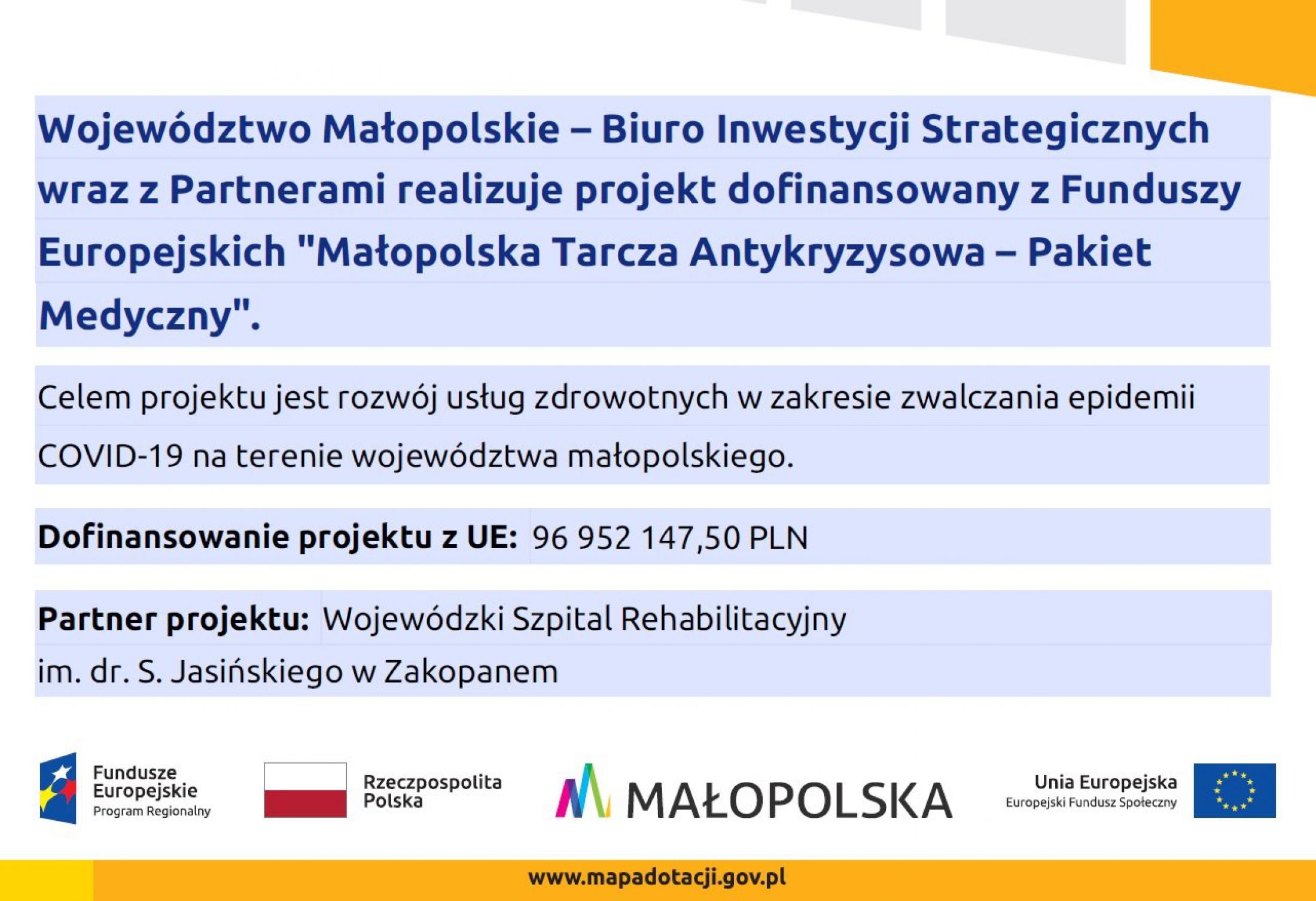 W ramach Projektu pn. „Małopolska Tarcza Antykryzysowa – Pakiet Medyczny” Wojewódzki Szpital Rehabilitacyjny im. dr. S. Jasińskiego w Zakopanem dokonuje na bieżąco zakupów materiałów medycznych, sprzętu oraz urządzeń, które wykorzystywane są w celu zapobiegania i przeciwdziałania rozprzestrzenianiu się wirusa SARS-CoV-2.