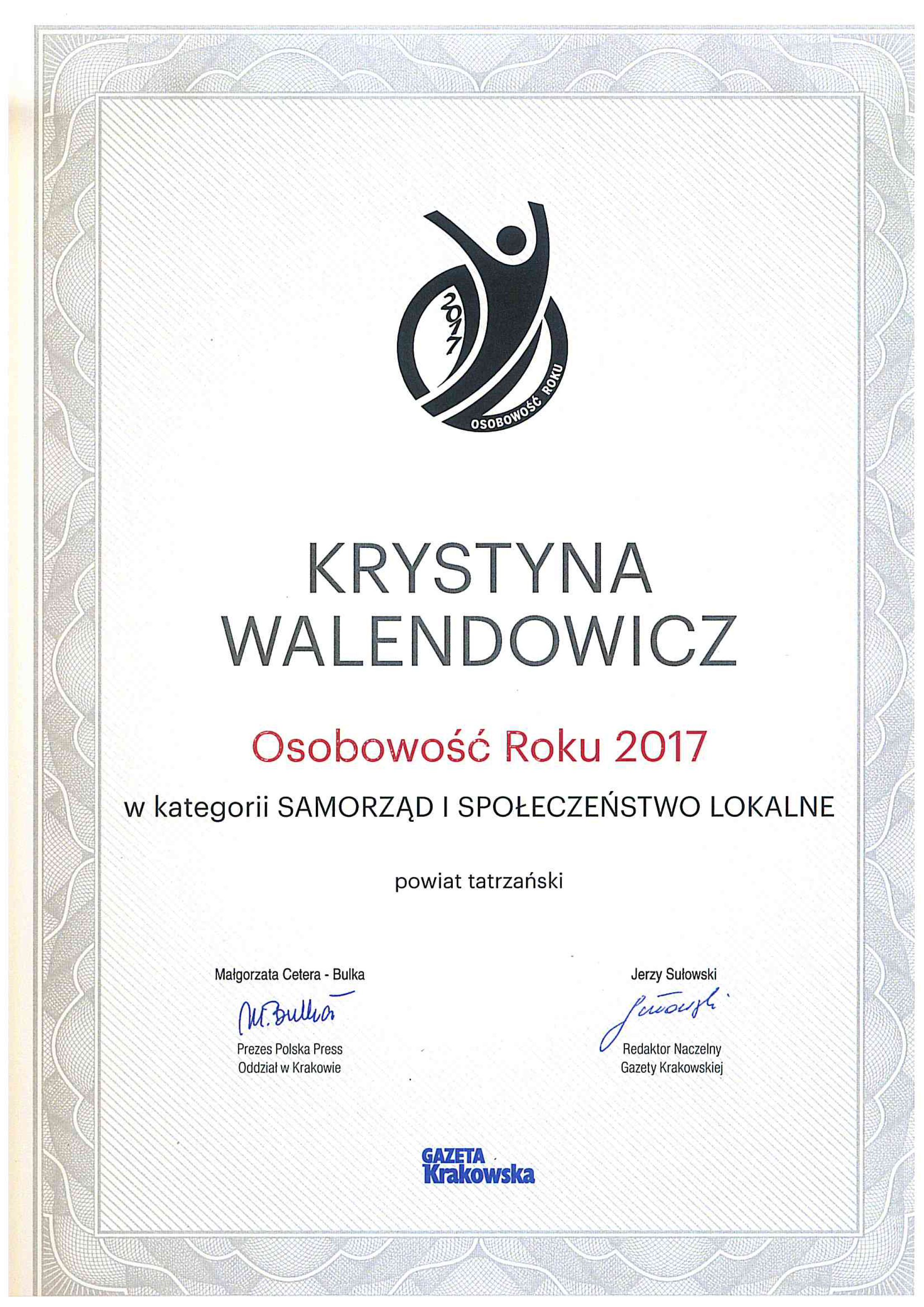 W rankingu Gazety Krakowskiej, Dyrektor Szpitala Krystynie Walendowicz został przyznany tytuł “Osobowość Roku” w kategorii “Samorządność i Społeczność lokalna”