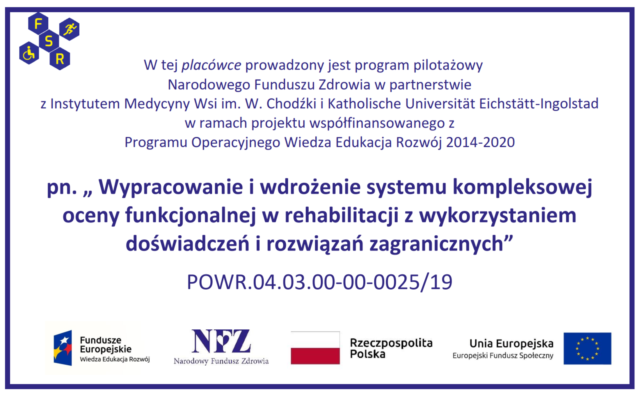 Działania te prowadzić będziemy w ramach projektu „Wypracowanie i wdrożenie systemu kompleksowej oceny funkcjonalnej w rehabilitacji z wykorzystaniem doświadczeń i rozwiązań zagranicznych”. Dla nas to ogromne wyróżnienie, ale i nie mniej wielka odpowiedzialność. Dlatego z dużym zaangażowaniem uczestniczący w projekcie pracownicy medyczni podeszli do organizowanego w dniach 4 i 5.04.2023 r. szkolenia, prowadzonego przez Instytut Medycyny Wsi. Do przyswojenia bowiem jest ogrom wiedzy – tak merytorycznej, jak i technicznej w zakresie realizacji projektu. Wszyscy bowiem chcemy, by realizacja projektu nie tylko służyła dalszemu doskonaleniu projektu, ale by także nasza wiedza w zakresie oceny funkcjonowania pacjentów mogła w pełni służyć pacjentom wszystkich oddziałów rehabilitacyjnych.