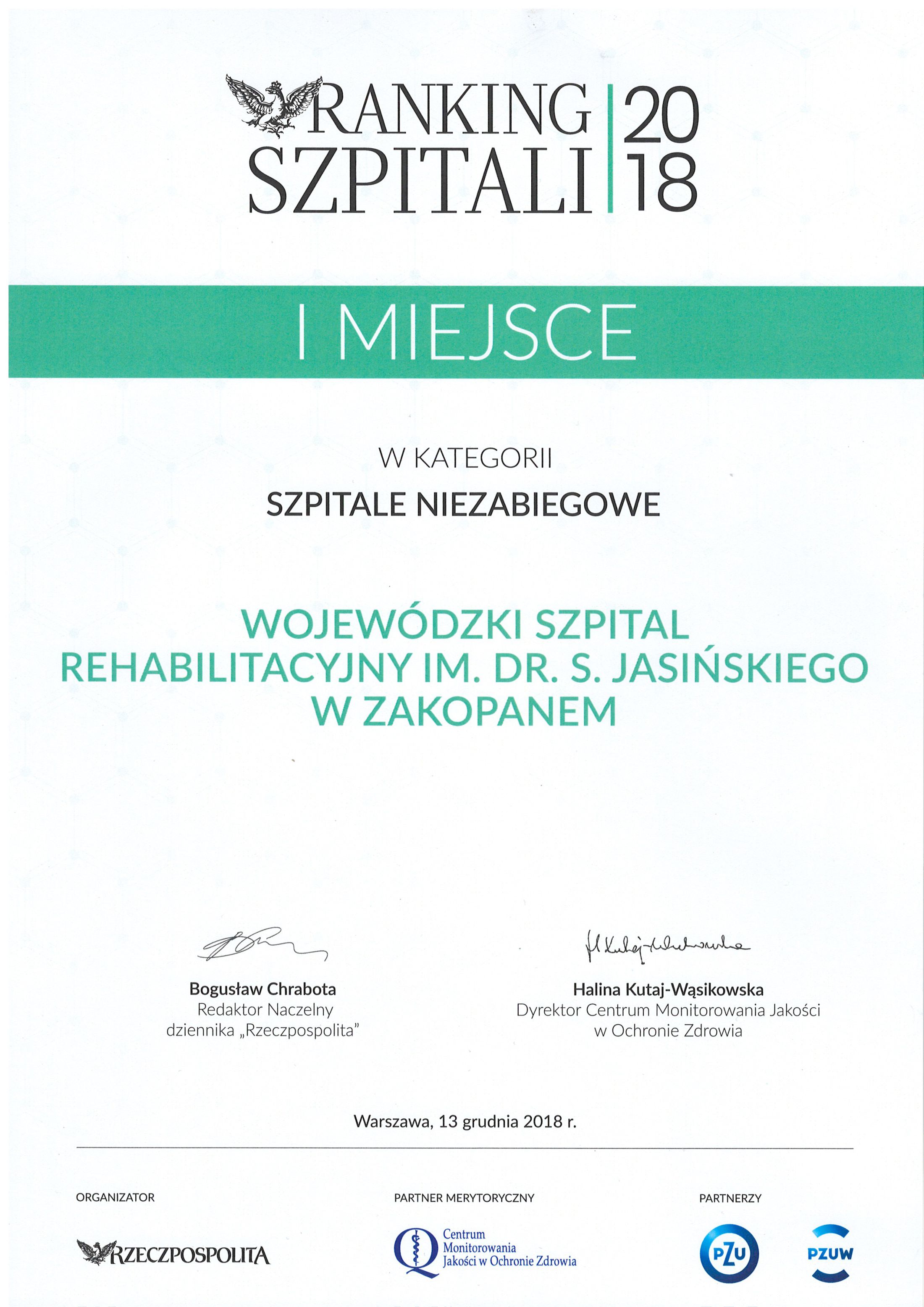 13 grudnia 2018 roku Wojewódzki Szpital Rehabilitacyjny im. dr. S. Jasińskiego w Zakopanem otrzymał prestiżową nagrodę za pracę nad jakością i bezpieczeństwem pacjentów. W rankingu opracowywanym przez „Rzeczpospolitą” i Centrum Monitorowania Jakości w Ochronie Zdrowia szpital uzyskał PIERWSZE miejsce w Polsce w kategorii „Szpitale niezabiegowe” .