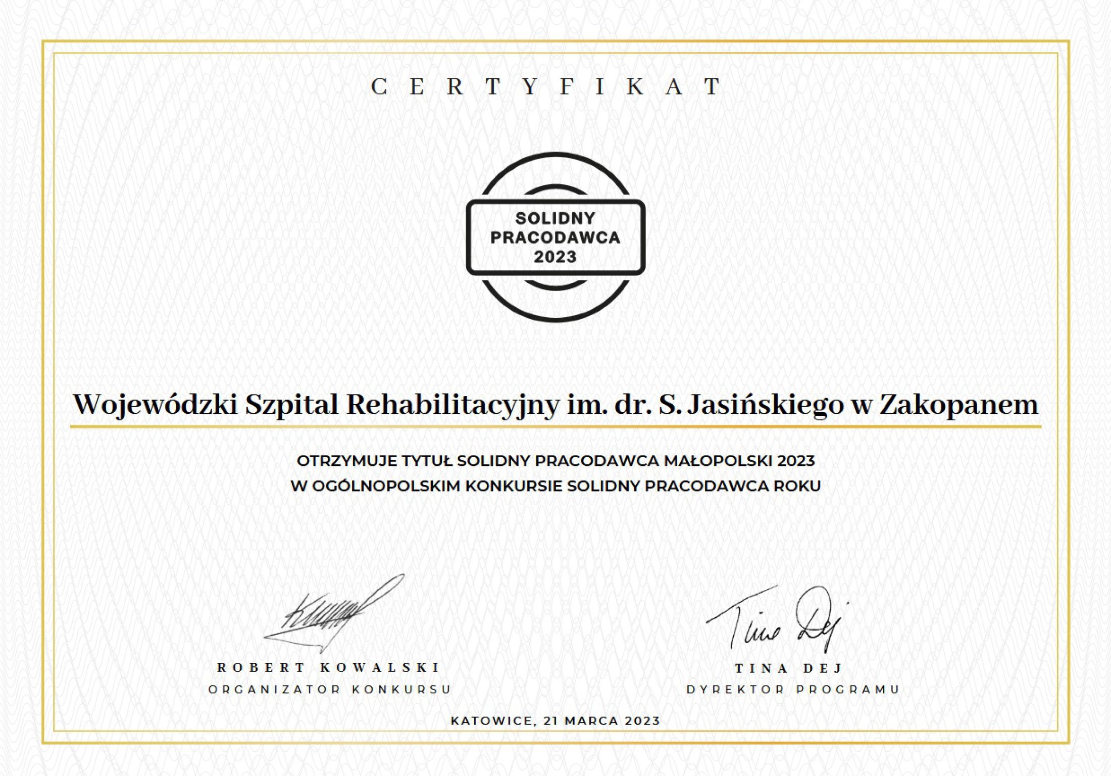 Okazuje się, że, tak jak w sporcie, trudniejsza jest obrona tytułu, niż zdobycie go po raz pierwszy. Z tym większą satysfakcję informujemy, że w wyniku podjętych szeroko zakrojonych starań Szpital nasz otrzymał ponownie Certyfikat „Solidny Pracodawca Małopolski”, tym razem opatrzony rokiem 2023.