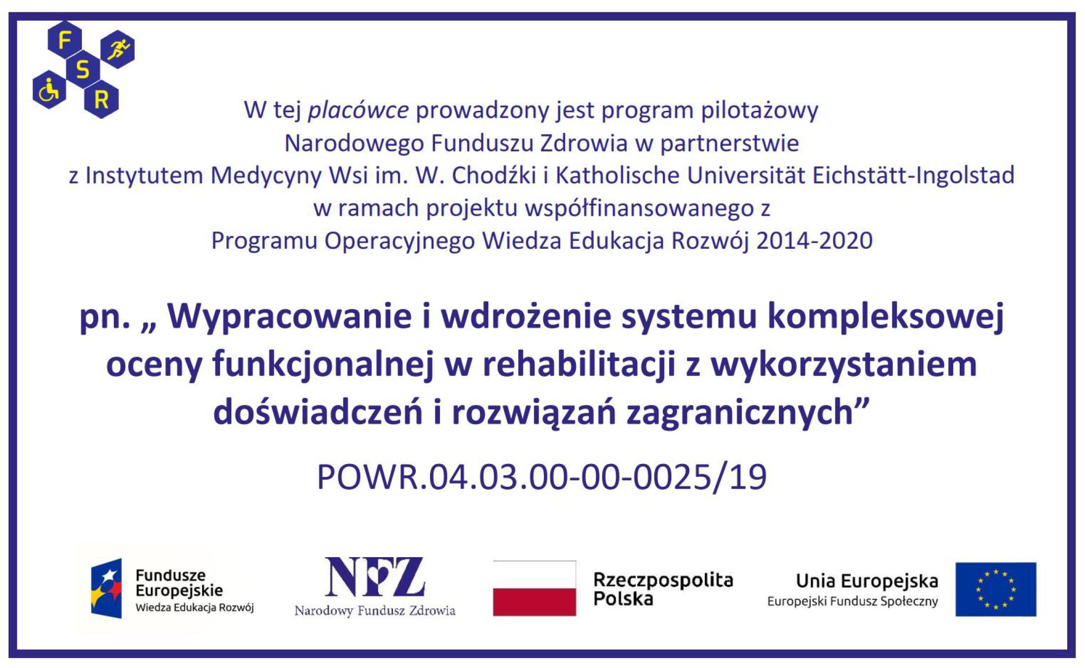 W okresie od kwietnia do września 2023 r. w naszym Szpitalu, jako jedynym w Polsce, realizowany był, organizowany przez Instytut Medycyny Wsi w Lublinie, pilotażowy program ocen funkcjonalnych pacjentów (ICF) w zakresie rehabilitacji pulmonologicznej.