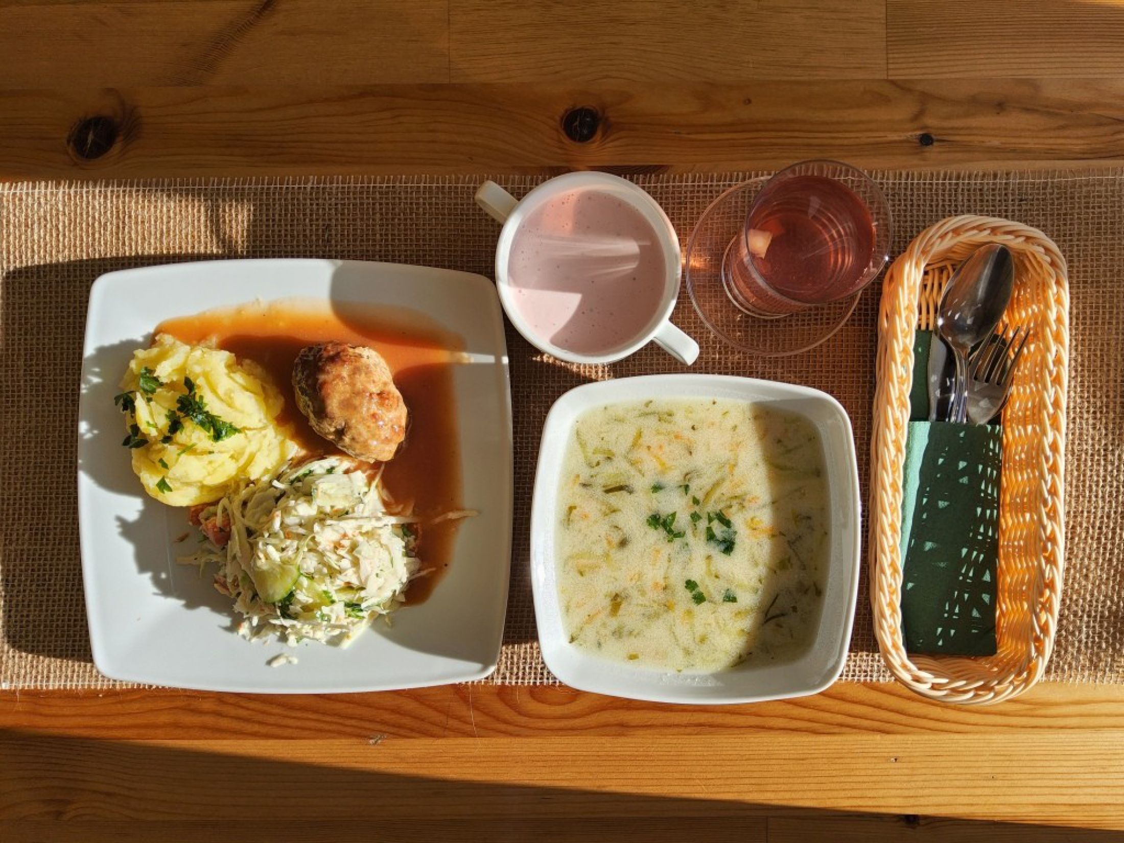 | dieta podstawowa | 450g Kwaśnica z ziemniakami 150g Udko z kurczaka pieczone 170 g Ziemniaki z masłem (laktoza) 150 g Surówka z selera (seler) 250g Kompot wieloowocowy |